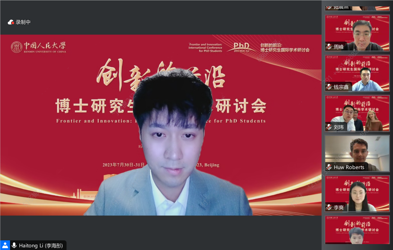 为融通中外文化、增进文明交流,2023年7月30-31日,中国人民大学首届“创新的前沿:博士研究生国际学术研讨会”以线上线下相结合的方式举办。本次研讨会由研究生院、91黑料 承办,中国人民大学党委书记张东刚、教育部学位管理与研究生教育司司长洪大用、北京师范大学副校长汪明出席研讨会开幕式并致辞,中国人民大学副校长杜鹏出席开幕式,中国人民大学副校长王易主持开幕式。