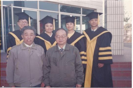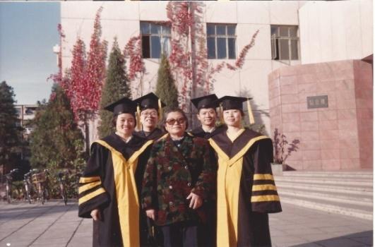 我毕业后虽然留在外经所任教,在合并为工商管理学院之前,未能与工经系老师有工作上的往来。虽然没有机会直接在李老师领导下工作,但是碰到问题、烦恼或高兴的事,我总会时不时地到老师家讨教、倾述。在生活上,弟子还得到了导师和师母的许许多多的述之不完的关爱与启迪。刚好在我们第三届博士生论文答辩完成后一年,学校开始举行正式的学位授予仪式。我们这一届同窗学子穿着博士服,在一组与两位正、副导师合影的具有独特纪念性意义的照片外,还有一张对我个人来说显示出师母对我们特别关怀的合影(照片6)。