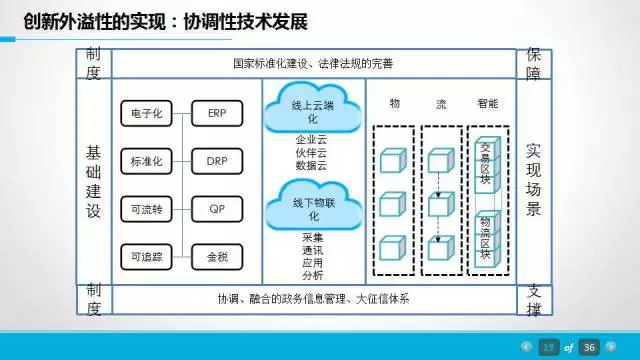 怎么去理解?第一个融合性的技术创新,就是鼓励多主体创新的同时实现多技术的融合创新与协作,形成体系化的技术。我觉得今天供应链金融也有一个可能的隐患那就是被我们的技术创新都被风头驱使,一说区块链大家疯了一样的都追区块链,但是忘记了一个问题,单一的技术不可能去打造我们的供应链金融,它一定是融合性的技术创新,包括了我们的电子合约、物联网、AR、VR,人工智能、大数据、云计算等等,所有这些技术的综合协调性的创新,才叫融合性技术创新,单一的一块不可能,这就涉及到一个问题协调技术发展,就是技术的创新发展需要与现实的产业相协调,用技术推动产发展,同时通过产业协同创新保障技术创新的有效性。