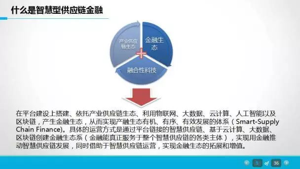具体什么是智慧型供应链金融?在平台建设上搭建、依托产业供应链生态、利用物联网、大数据、云计算、人工智能以及区块链,产生金融生态,从而实现产融生态有机、有序、有效发展的体系(Smart-Supply Chain Finance)。具体的运营方式是通过平台链接的智慧供应链、基于云计算、大数据、区块链创建金融生态系(金融能真正服务于整个智慧供应链的各类主体),实现用金融推动智慧供应链发展,同时借助于智慧供应链运营,实现金融生态的拓展和增值。这是我们今天的一个核心。