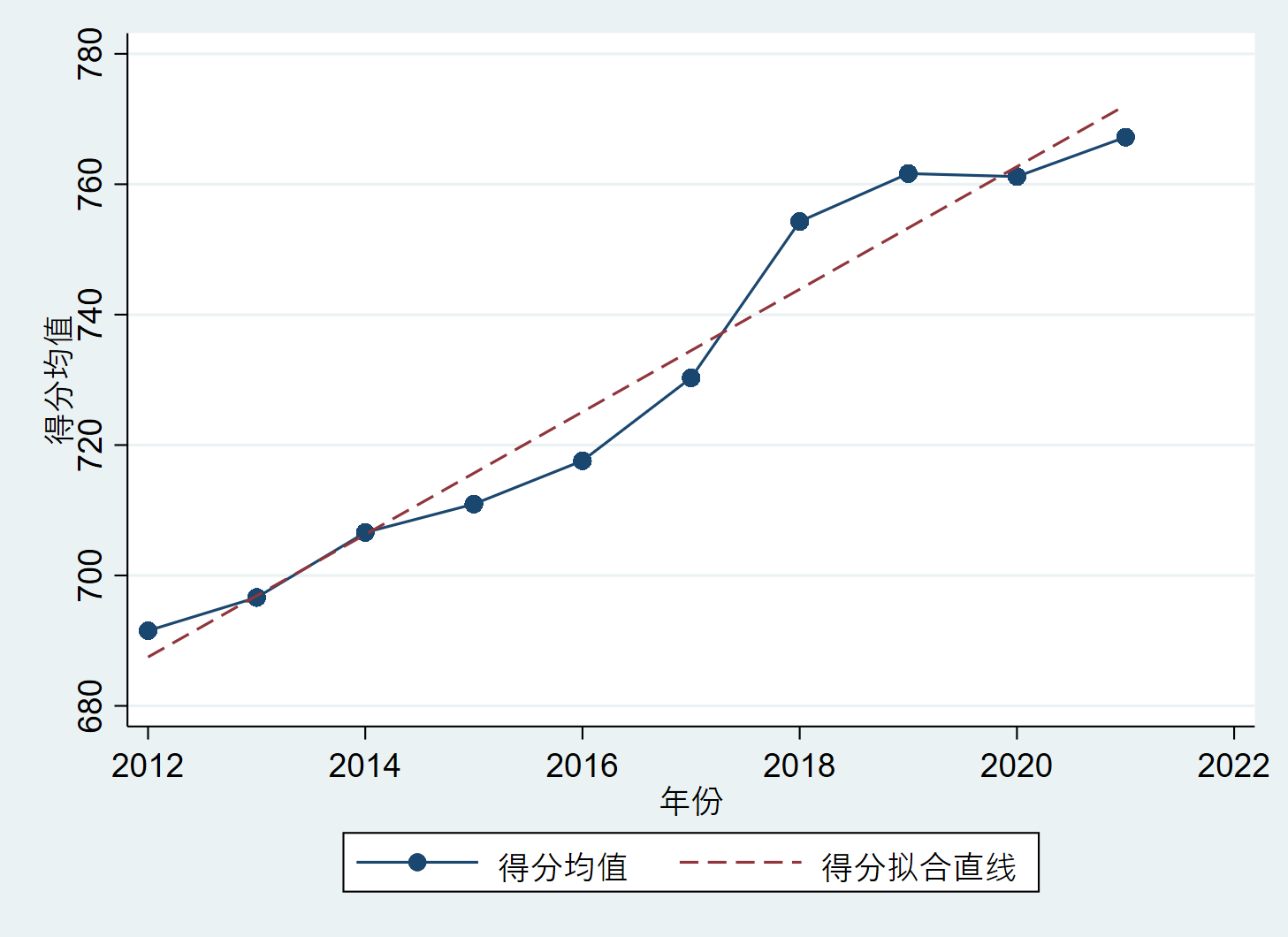 本研究利用中国2012-2021年上市交易的所有公司在建设世界一流企业的进程中的发展指数进行了测量。在计算过程中,按照证监会行业分类方法,剔除企业过少和综合类行业,总共得到47个行业,建设世界一流企业发展指数排名前300公司总得分见图2。总体而言,2012-2021年这10年间,得益于我国工业化的基本完成、国民经济的成长,总得分呈现出上升趋势。