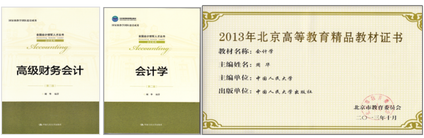 自博士毕业留校以来,周华基于上述原创成果撰写了各类教学项目的讲义,这些研究型教学资料受到学员们的普遍欢迎。2010年,他被吸纳加入伊志宏教授率领的国家级优秀教学团队“工商管理核心课程教学团队”。随后,在中国人民大学出版社的督促下,他把讲义转变为教材,独立编著共约140万字的《会计学基础》、《中级财务会计》、《高级财务会计》、《会计学》等“会计学原论”系列教材,自2011年起陆续出版。这套教材根据我国基本法律关于民事权利的规定,按照物权、债权、知识产权、股东权的顺序讲解资产的会计处理,在阐述会计规则的同时还运用相关学科的知识点来答疑解惑,尤其强调会计规则的法律背景和理论依据。书中设专栏扼要讲解了相关的流转税法、所得税法、公司法、金融法、票据法、知识产权法。实践证明,将经济法、税法和会计学课程紧密结合起来,有助于同学们建立起交叉贯通的知识结构,能够起到事半功倍的效果。教材中设置专栏,对流行的境外学说进行辩证分析,受到兄弟院校师生的欢迎。