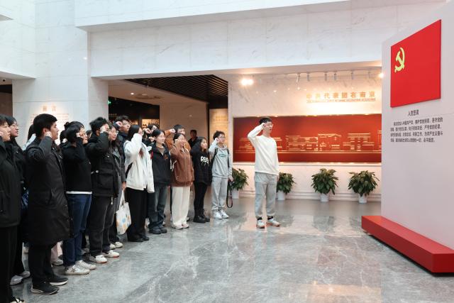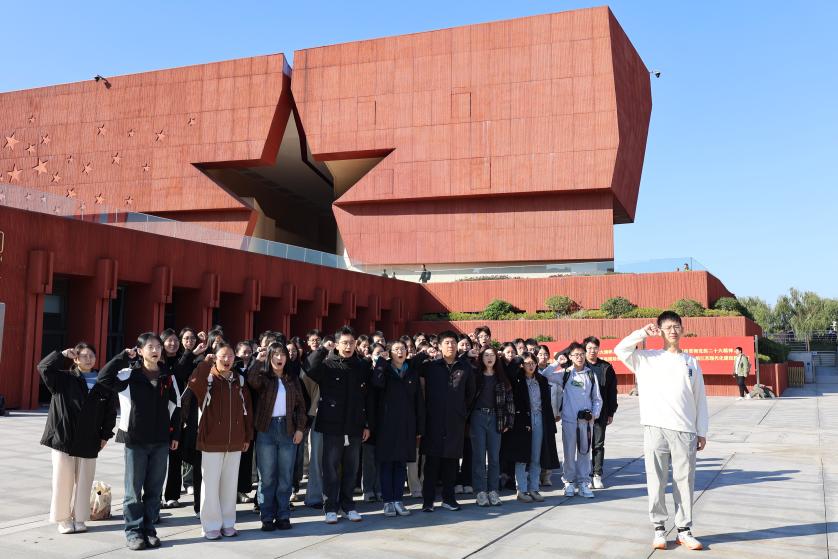 11月23日上午,调研一行人来到位于江苏省南京市鼓楼区渡江路1号的渡江胜利纪念馆。在庄严的五角星镂空展览馆前,同学们面对党旗,重温入党誓词。