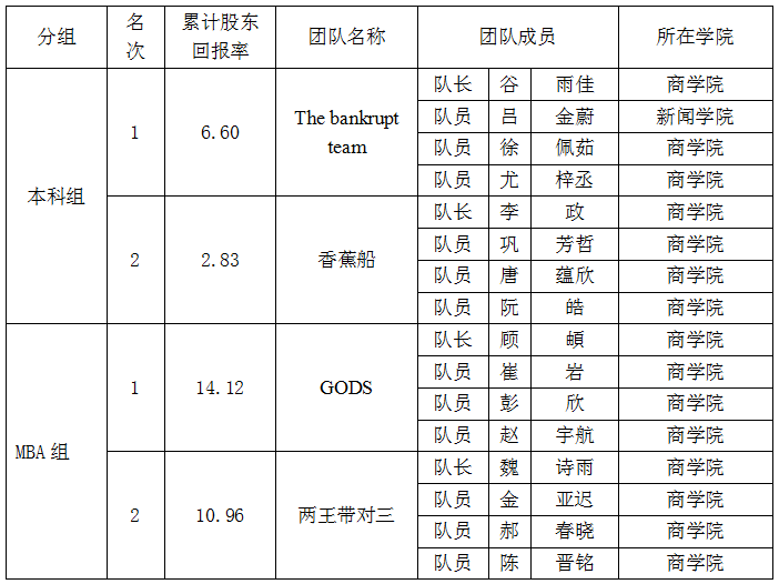 最终本科组冠亚军由团队“The bankrupt team”、“香蕉船”分别获得;MBA组冠亚军由团队“GODS”、“两王带对三”分别获得(团队信息见文末)。四支队伍将代表中国人民大学直接晋级第十届“尖烽时刻”全国商业决策模拟大赛复赛,在此预祝他们取得好成绩!
