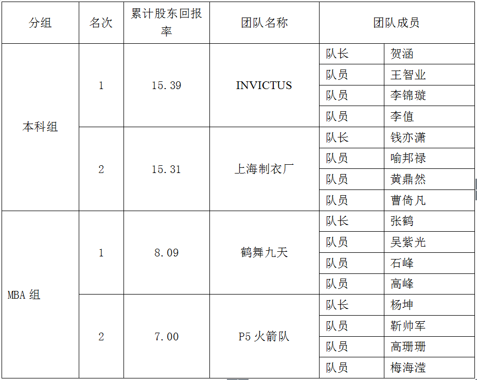 最终本科组冠亚军由团队“INVICTUS”、“上海制衣厂”分别获得;MBA组冠亚军由团队“鹤舞九天”、“P5火箭队”分别获得(团队信息见文末)。预祝他们在2019年第十一届“尖烽时刻”全国商业决策模拟大赛复赛中取得好成绩!
