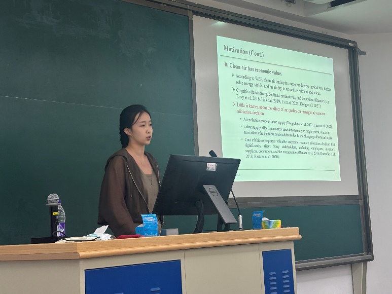 会计系博士生王瀛报告论文《Cleaner Air and Labor Cost Stickiness:Evidence from the Clean Heating Plan in China》。文章基于清洁取暖试点政策这一准自然实验,发现政策实施后试点城市企业的劳动成本黏性显著降低。这一效应源于清洁取暖政策通过减少碳排放和空气污染,有效改善了城市环境质量,从而提升了本地劳动力供给。