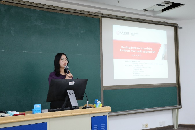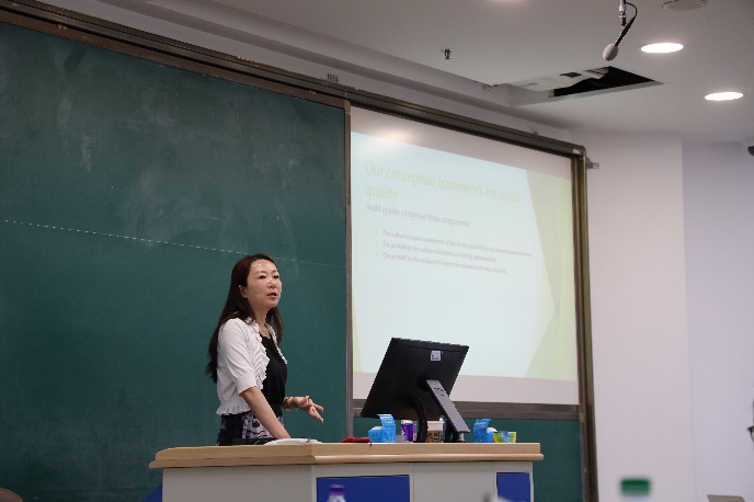会计系博士毕业生、现任南京航天航空大学副教授刘云菁报告论文《Herding Behavior in Auditing: Evidence from Audit Adjustments》。文章利用中国独特的审计前和审计调整数据,考察了审计师是否会基于行业基准进行审计调整以向行业趋同,首次为审计过程中的羊群行为提供了实证证据。
