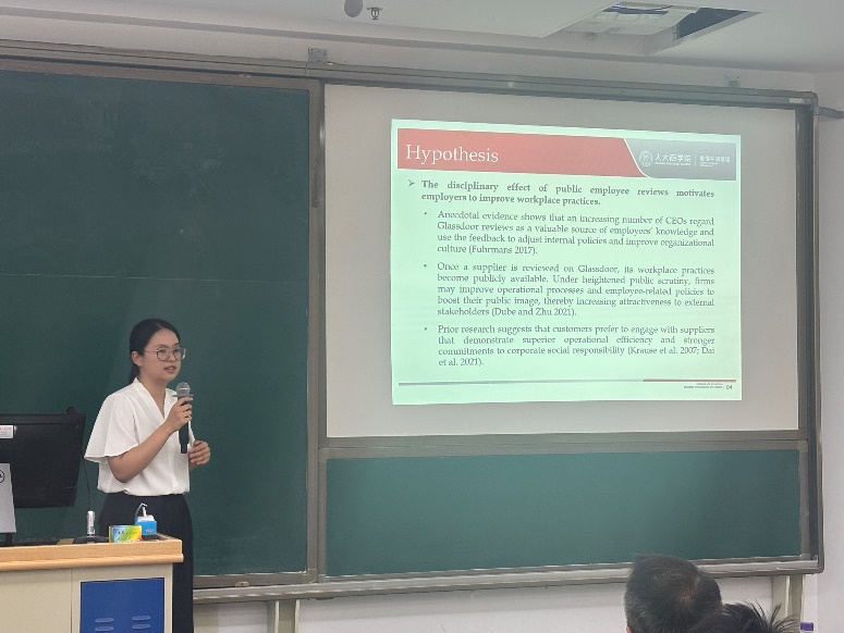 财务与金融系博士生张洁报告论文《The Importance of Workplace Transparency to Customer-Supplier Relationships: Evidence from Glassdoor Reviews》。文章利用供应商在 Glassdoor上的员工评价信息,发现客户对供应商工作场所信息的获取,有助于降低供应链关系终止的可能性。