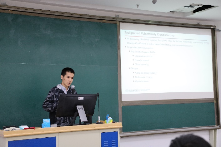 会计系博士生张锴滨报告论文《Vulnerability crowdsourcing and corporate cybersecurity awareness: Insights from the Wooyun platform》。文章利用乌云网的独特数据,发现白帽黑客的漏洞报告能提升公司网络安全意识,促使公司采取网络安全的相关措施。其中,使用大语言模型对年报文本进行分析和度量网络安全意识。