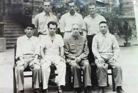 玉素甫校友(前排左一)与吴玉章老校长(前排右二)合影