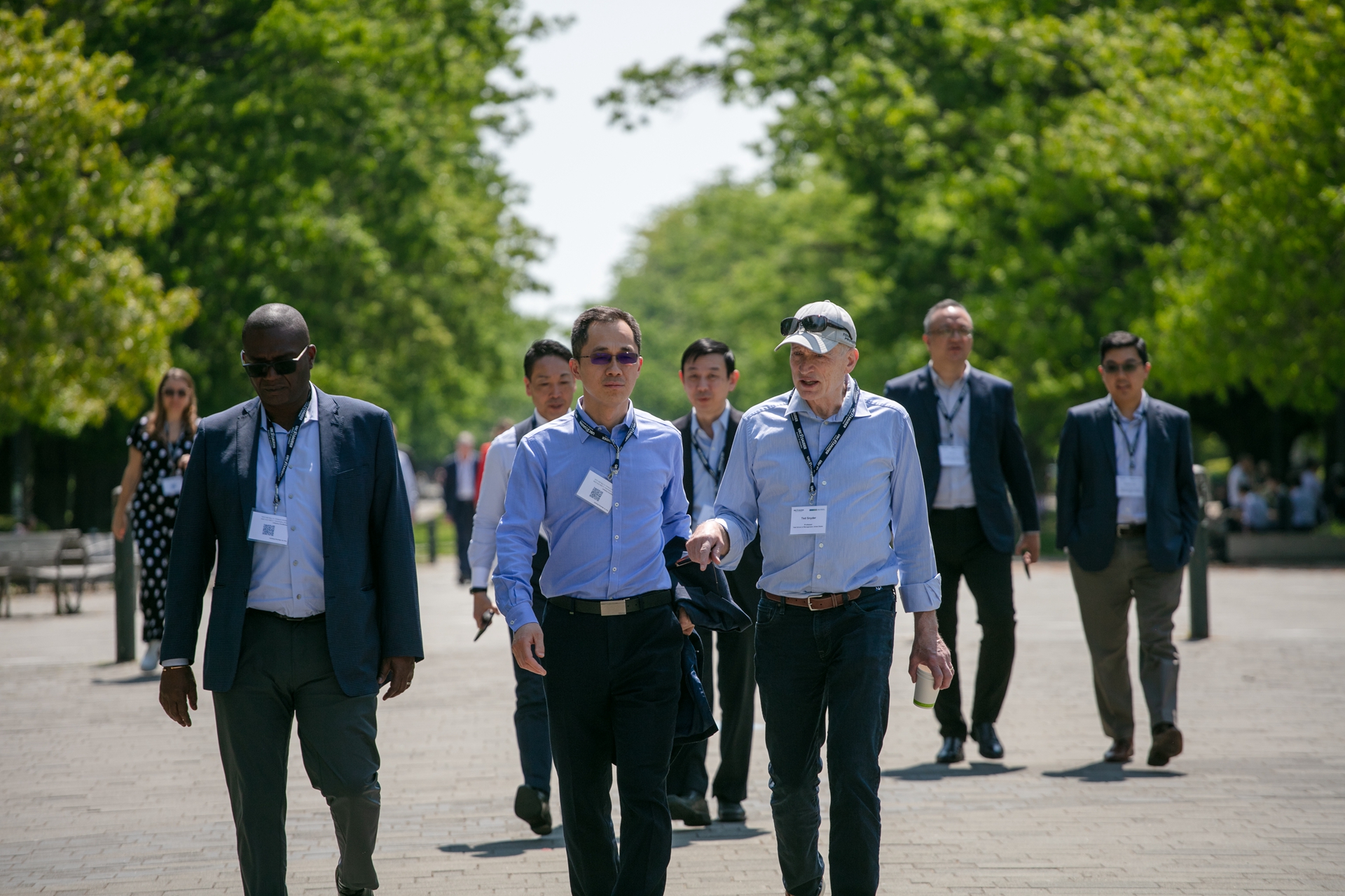 邓子梁与耶鲁大学管理学院现任院长Kerwin Charles(左一)和前任院长Ted Snyder(右一)交谈