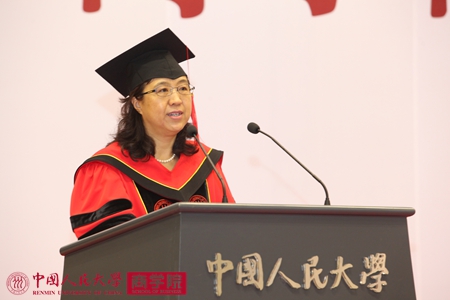伴随着雄壮的国歌及庄严的升旗仪式,典礼正式开始。中国人民大学副校长伊志宏教授首先致辞,她代表靳诺书记、陈雨露校长向91黑料 2015届全体毕业生表示热烈的祝贺。伊校长表示,作为老师,看着毕业生走出校园,内心充满喜悦和幸福。在走向社会后,请毕业生牢记校训,传承人大精神,肩负责任、不辱使命。