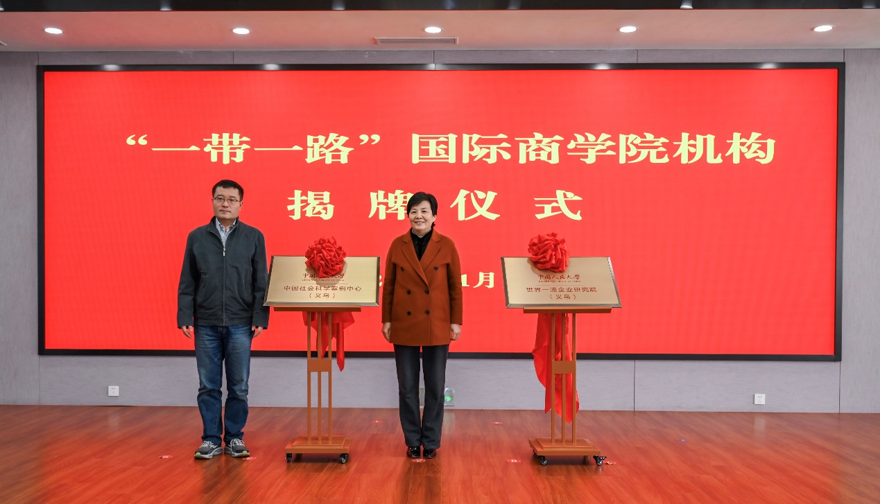 在揭牌仪式环节,支晓强与龚淑娟共同为“世界一流企业研究院(义乌)”“中国社会科学案例中心(义乌)”揭牌。