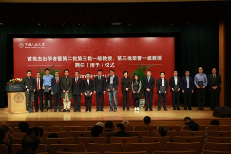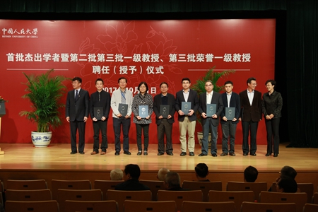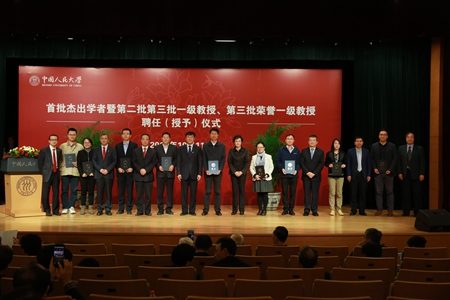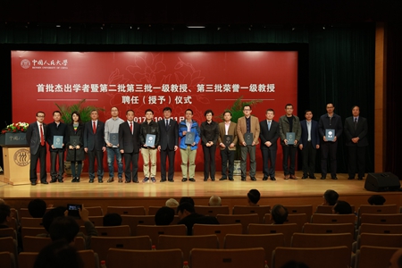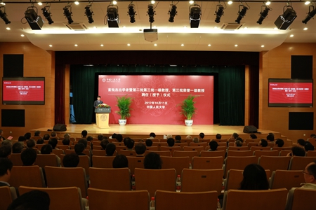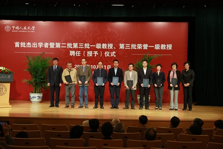 10月11日下午,中国人民大学首批“杰出学者”暨一级教授、荣誉一级教授聘任(授予)仪式在八百人大礼堂举行。中国人民大学党委书记靳诺、校长刘伟在会上致辞,全体校领导为首批“杰出学者”颁发聘书。