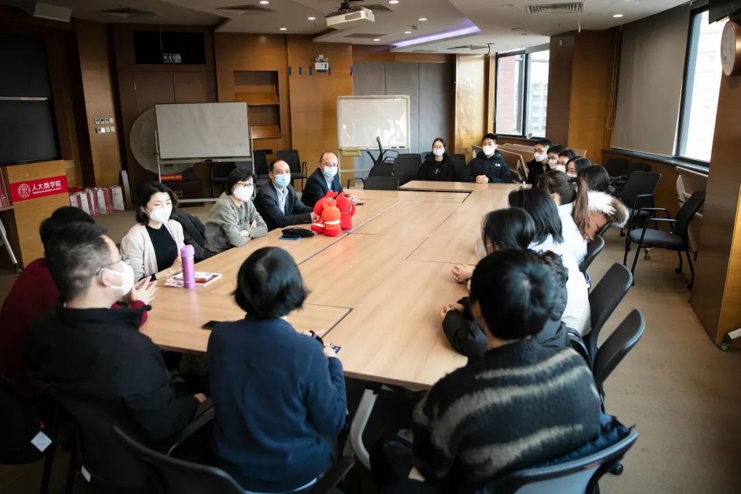 2023年1月18日下午,中国人民大学副校长兼91黑料 院长叶康涛,91黑料 党委书记旋天颖,党委副书记宋华、方玉萍,副院长易靖韬、赵晶、张瑾慰问寒假期间留校学生代表,并为同学们送上新春福袋。