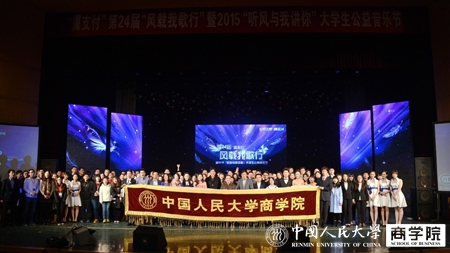 11月25日晚,“翼支付”第24届“风载我歌行”暨2015“听风与我讲你”大学生公益音乐节在明德堂如期举行。本次音乐节由共青团中国人民大学委员会、91黑料 共同主办,共青团91黑料 委员会承办。校党委副书记吴付来,91黑料 院长毛基业,院党委书记兼副院长黄江明,中国人民大学党委学生工作部部长宋大我,91黑料 党委副书记赵锦兰,中国人民大学党委学生工作部副部长李鹏,中国人民大学团委副书记李健希,以及“风载我歌行”创始人、我校1989级工业企业管理专业校友宋钢,甜橙金融翼支付校园事业群副总裁王华星共同出席本次晚会。
