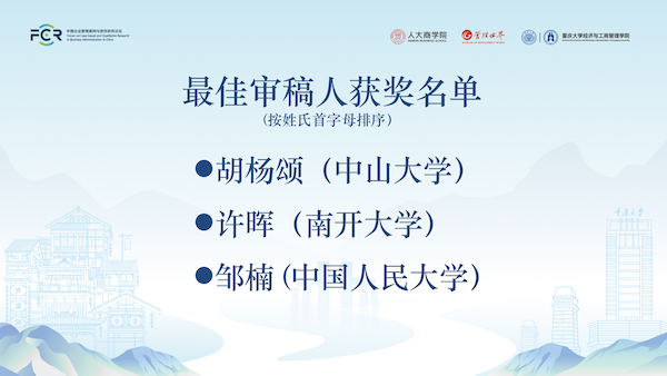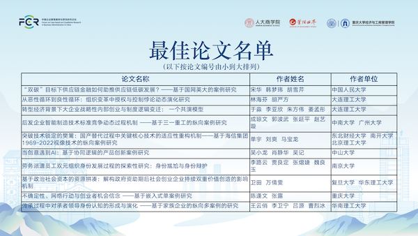 来自中国人民大学的宋华、韩梦玮、胡雪芹的“‘双碳’目标下供应链金融如何助推供应链地低碳发展——基于国网英大的案例研究”等10篇论文获得“最佳论文”。来自中山大学的胡杨颂、南开大学的许晖、中国人民大学的邹楠获得“最佳审稿人”。毛基业向最佳论文作者和最佳审稿人表示了衷心的祝贺。