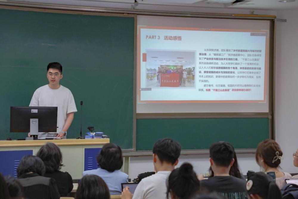 黄微介绍2023年项目筹备情况及项目设计。在圆满完成两期“千里江山”调研实践项目任务后,以“内涵更深、机制更优、体系更全、保障更强、成效更实”为目标,学院再次对第三期项目进行了系统性的升级优化。其中一个重要变化就是在筹备阶段邀请更多专业教师进行项目全流程参与指导,并设计“熔炼团队,蓄力前行”“走进现场,实地调研”“凝练思想,持续改进”三大模块。 “熔炼团队,蓄力前行”模块将设置团队熔炼活动及先导课程,做到理论知识提前学,调研队伍提前练,企业问题提前找,调研方案提前做;“走进现场,实地调研”模块将围绕乡村振兴、城市基层治理、特色企业、校友事迹等维度深入基层听、沉到一线看、走进现场学、投身实际用;“凝练思想,持续改进”模块坚持师生共同总结,力求把握研究重点,提炼规律问题,力争完成能够解决实际问题的调研报告,并通过总结报告会对项目整体进行再次优化升级。
