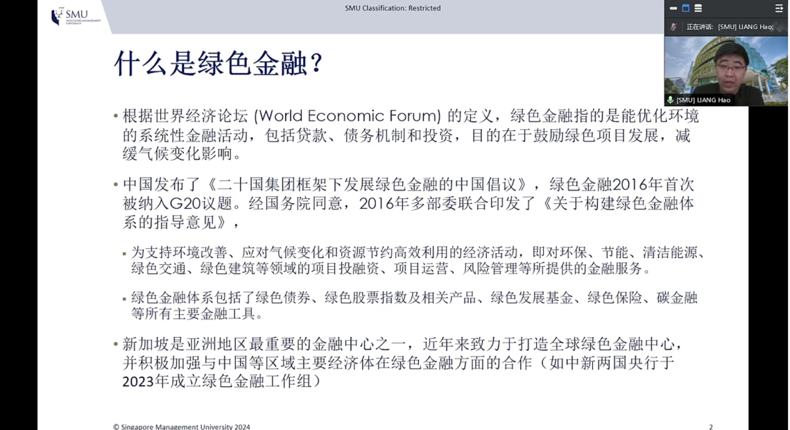 梁昊以“什么是绿色金融”为题进行分享。他先后介绍了绿色金融的定义,“企业绿色转型”“金融市场与金融工具”“如何度量与报告绿色行为”等绿色金融课程内容,以及当前绿色金融的发展趋势与研究机遇。
