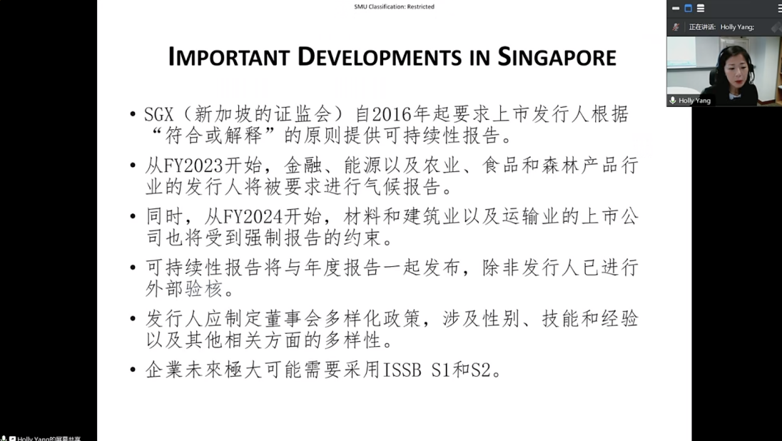 HollyYang在报告中分享了新加坡管理大学开设可持续性报告课程的经验做法。她从新加坡等国家和地区的最新监管动态、世界对可持续发展话题的认识不断深入等背景信息出发,着重介绍了可持续性报告课程教材选择、教学过程设计等方面的内容。